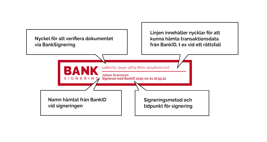 När en signering gjorts via BankSignering skapas en låst PDF med en stämpel som innehåller verifierbara nycklar mot både BankID och BankSignering. Det innebär att all data om signeringen kan återskapas, antingen genom att man kontrollerar signaturens certifikat och den signerade texten mot BankID eller att det sker via BankSignering. Det gör att den signerade PDF:en klassas som en "avancerad elektronisk signatur", vilket i sin tur gör att den är godkänd av svenska myndigheter, Bolagsverket, PRV, domstolar och kan användas som bevismaterial vid rättegångar.
